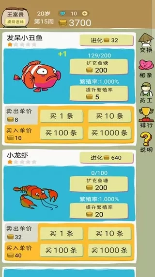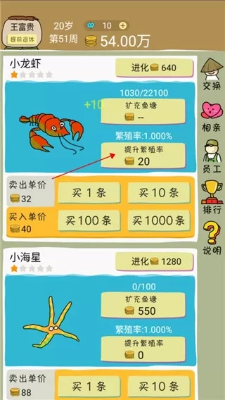 3、致力于提高鱼的繁殖率,加快鱼的繁衍速度。同时,借助进化促使鱼的品种得到升级,如此一来,便能卖出更高的价钱。