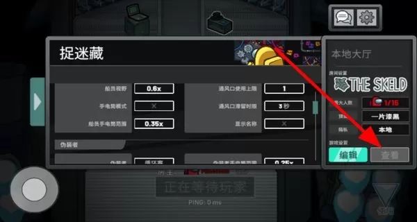 3、来到本地大厅的捉迷藏模式设置页面,在这里可以对船员视野、手电筒范围等参数进行调整,也能够编辑或者查看房间设置,一切准备妥当后,就等待玩家加入。