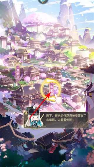 3、前往宫殿区域,点击朱紫殿标识,前往该宫殿区域,开展与新臣安置、宫廷事务相关的任务,推进宫廷管理进程。