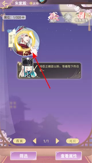 4、召见宫廷角色,在朱紫殿界面中,点击贺兰辞的角色图标,召见该角色,进行对话、分配任务或查看其属性。