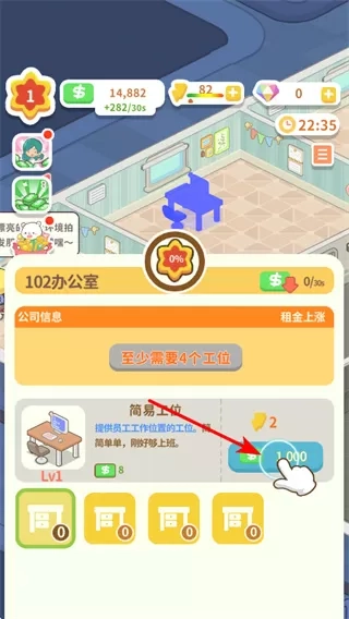 4、建设工位设施,在102办公室中,点击工位建设按钮,投入资金建设简易工位,完善新办公室的基础设施。