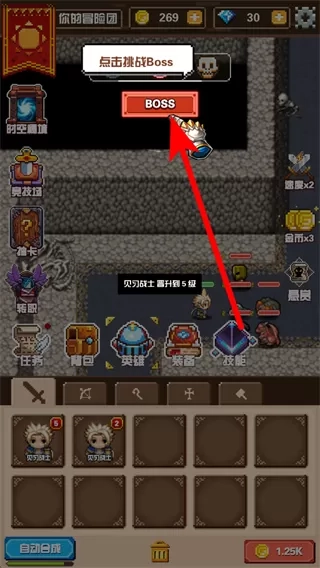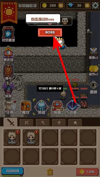 3、在战斗过程中,你可以点击“BOSS”按钮,向强力敌人发起挑战。成功击败BOSS后,将获得丰厚的奖励。战斗时,需时刻留意英雄状态,并合理安排技能的释放时机,以此提高战斗效率,更快地推进冒险进度。