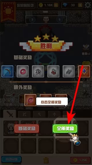 4、战斗结束后,屏幕会弹出奖励界面,此时务必点击“全部奖励”按钮,以领取所有奖励,其中涵盖装备、道具等,这些奖励能为后续英雄养成、装备强化提供资源支撑。