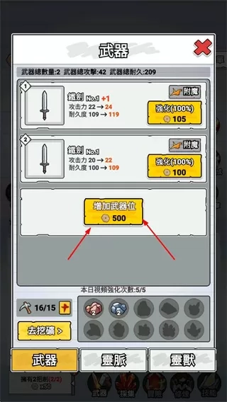 1. 于武器界面进行武器强化操作,以此提升武器的攻击力与耐久度,并增加武器的数量。