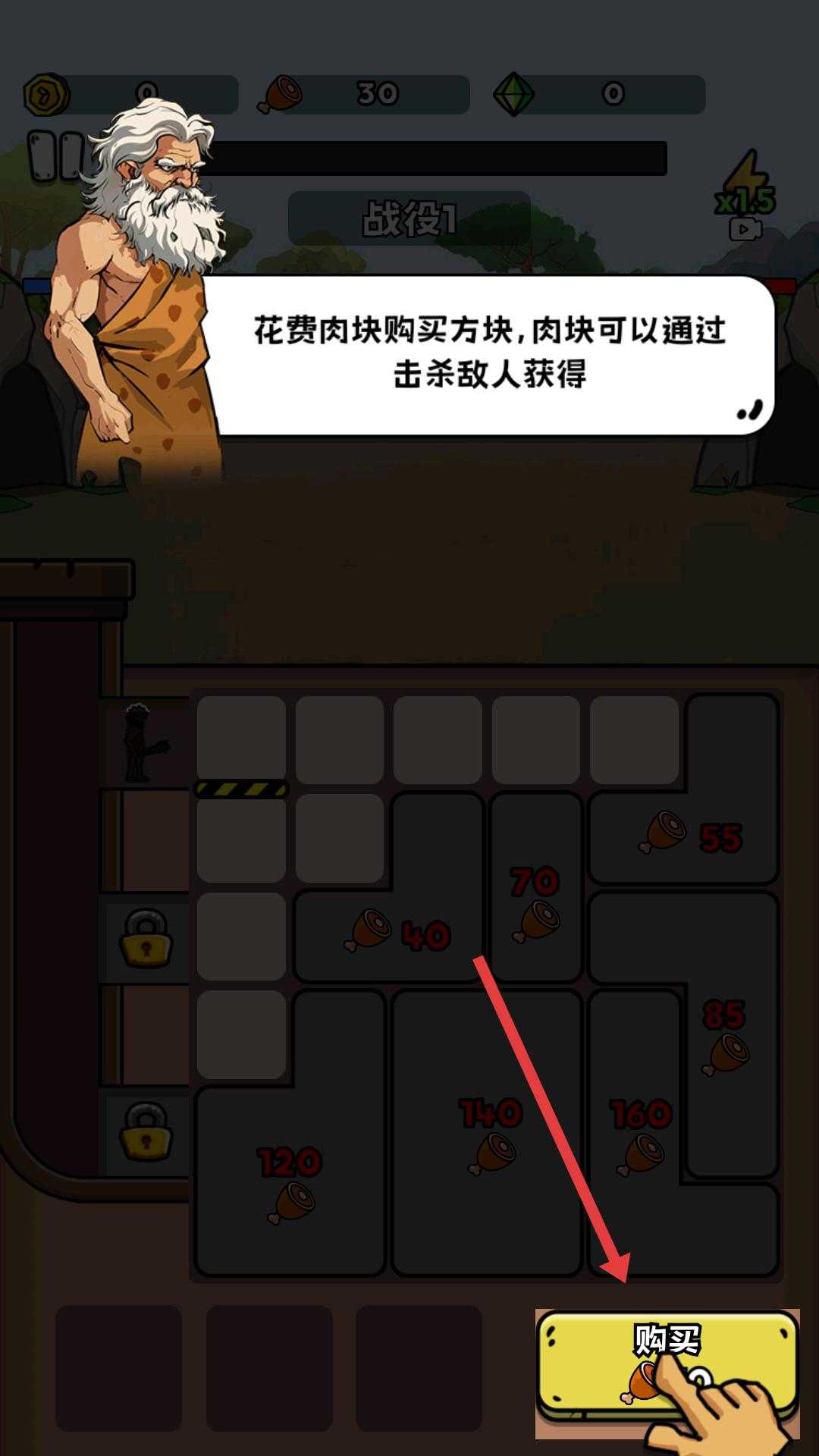 1、玩家使用肉块购买方块,而肉块可通过击杀敌人获取,借此提升自身的战斗能力。
