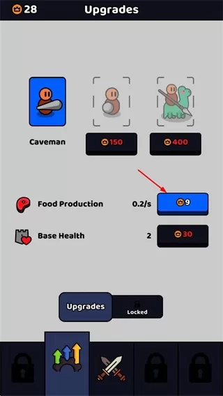 3、于升级界面,耗费金币对穴居人、食物产出以及基地生命值进行升级,以此提升战力与生存能力。
