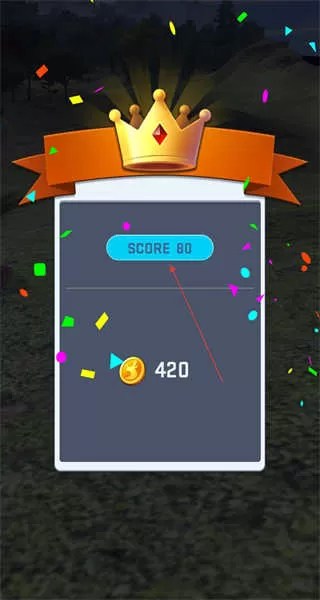 3、成功完成射击任务后,弹出结算界面,展示获得的分数和金币数量,还有庆祝的彩屑效果,查看游戏成果。
