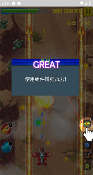 4、游戏会弹出提示,提醒你可借助组件增强战力。此时,点击右侧相应的组件按钮,通过使用组件来提升飞机战力,从而更高效地投入战斗。