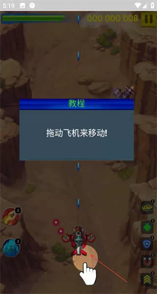 2、游戏弹出教程提示框,提示拖动飞机来移动,按照提示,通过拖动操作控制飞机移动,熟悉基本操作方式。