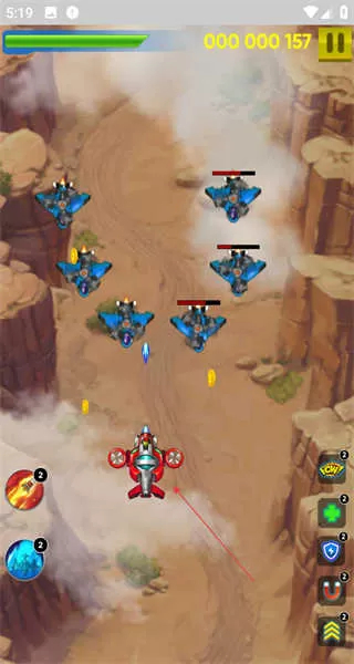 3、接着进行游戏,会遭遇多架蓝色敌机。此时需操控飞机灵活移动,发射子弹对这些敌机展开攻击。与此同时,别忘了收集场景里的金币,以此来积累游戏分数。