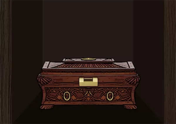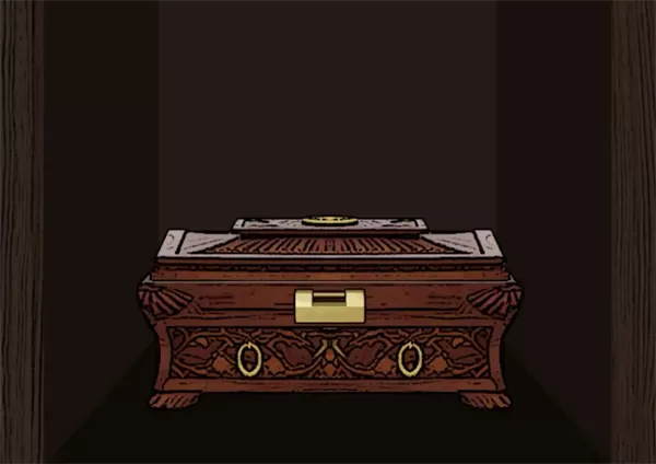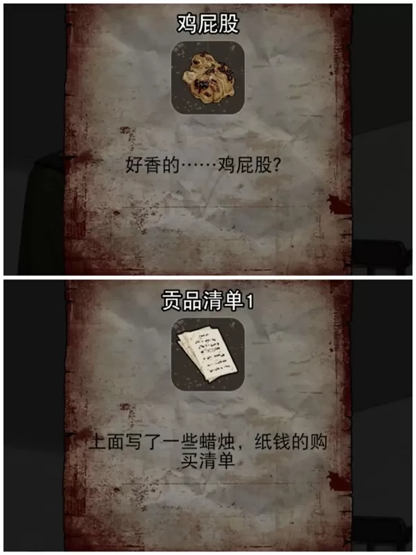 要消除两波等重量的砝码(比如9和3、6这一组,或者7和2、5这一组,任选其一就行)。只有出现一个鬼脸所穿戏服的颜色与之相同,才能够继续,否则就直接判定死亡(我每次都是选绿戏服,不过鬼脸的颜色红绿都有出现过,这就得看运气了)。接着,用钥匙打开盒子,就能获得贡品清单2 。