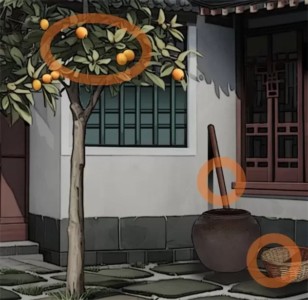 别雅园:入园后,先往左边走,捡起地上的钩耙、烂枇杷以及左下角的砝码,接着用钩耙去够树上的枇杷,从而获取枇杷。