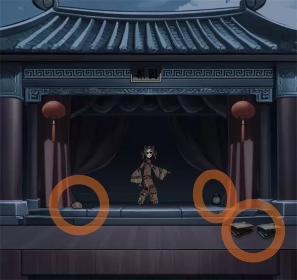 往右边走(前方有高能突脸预警!!!),取走戏台左右两边的物品,茶包以及胭脂。台子上还有红、绿两种颜色的戏服(此处戏服的拿取和文思堂鬼脸的颜色存在关联,不过经过多次尝试发现似乎是完全随机的,所以随意挑选穿上就行)