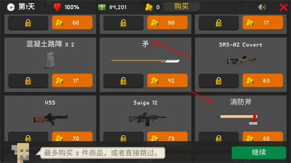 3、在商店购买武器、道具,提升战斗与防御能力,为对抗僵尸奠定基础。