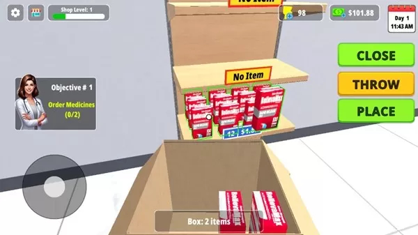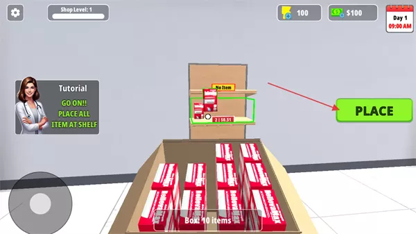 4、把箱子里的物品摆放到指定货架上,点击“PLACE”按钮以完成放置操作,按步骤完成药房的前期布置工作。