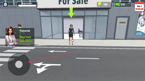 1. 在游戏开始时,利用左侧的虚拟摇杆来控制角色移动,朝着标有ForSale的药房行进。