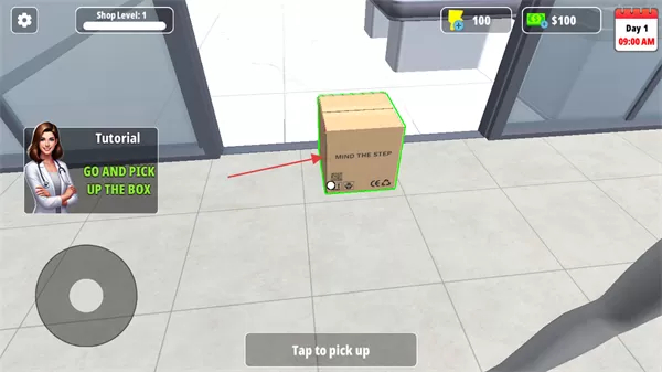 2、走进药房,靠近地面上的箱子,按照提示点击屏幕来拾取箱子。