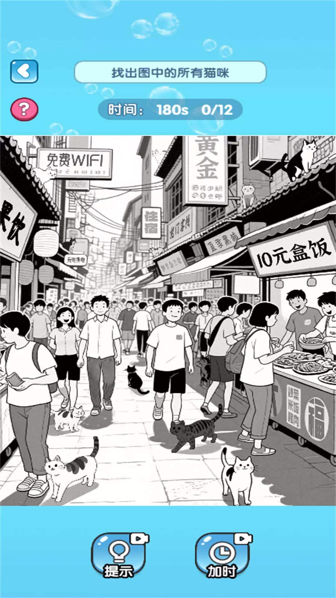 2、首次游玩从基础找物关卡入手,如找出图中的所有猫咪,熟悉画面互动方式与目标搜索节奏,建立解题思路。
