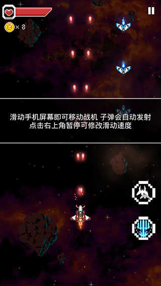 2、滑动手机屏幕即可移动战机,子弹会自动发射,点击右上角暂停可修改滑动速度。