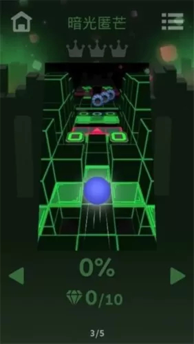 期间无需上滑使球跳起,方向最重要,会自动跃过方块,只需操纵落点方位,遇到红色图案的钻石,滚到所在位置吃掉,一路沿着缝隙处穿滑而过即可。