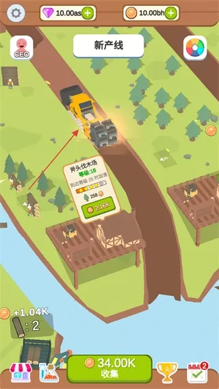 4、当木材积累到一定程度,出现新的生产区域解锁提示,花费金币解锁,拓展游戏内容。