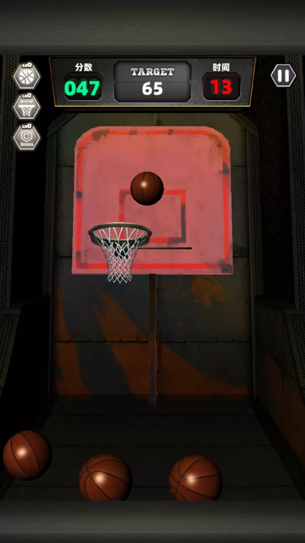 1、每个关卡都有不同的分数挑战,玩家要在有限的时间内尽可能多的投篮,努力获得更高的分数。