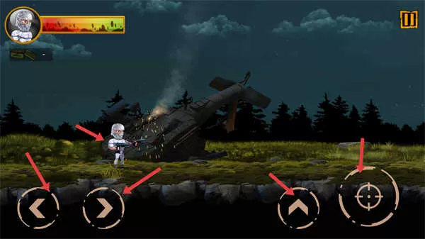 3、进入战斗场景后,通过左侧方向键控制英雄移动,右侧设有跳跃、射击等功能键,利用这些按键在场景中行动并攻击目标。