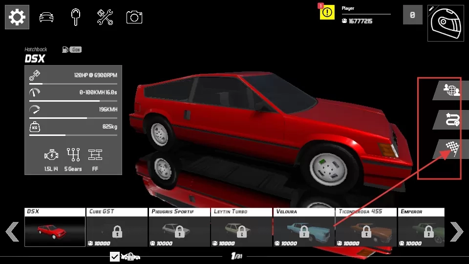 1、踏入游戏主界面,一辆酷炫的红色赛车映入眼帘,挑选下方自己心仪的赛车,预备开启一场扣人心弦的比赛。