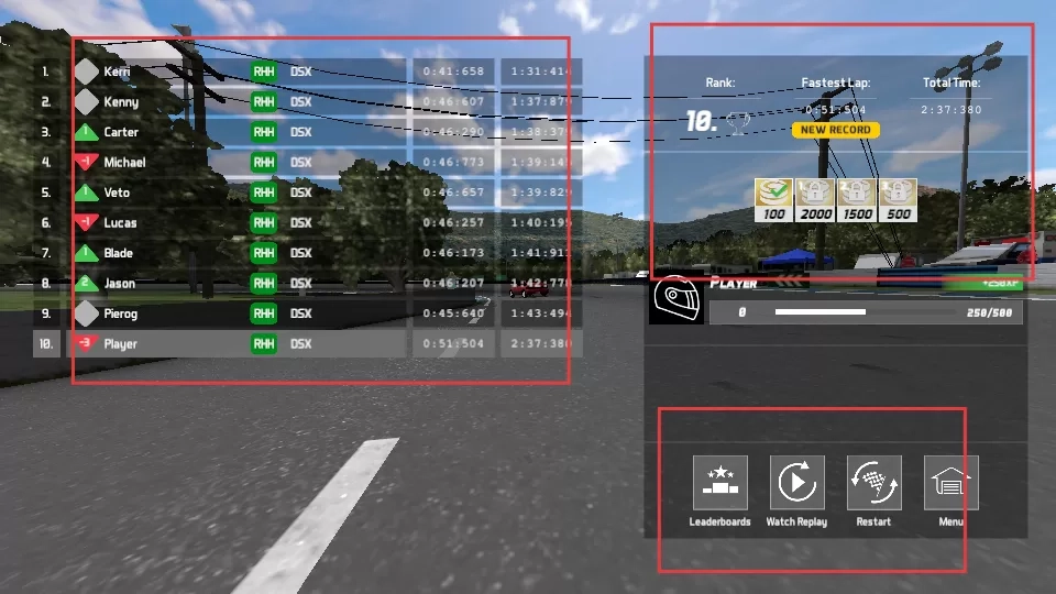4、比赛结束后,查看排名和用时等成绩,还能选择看回放、重开或返回菜单,继续赛车之旅。
