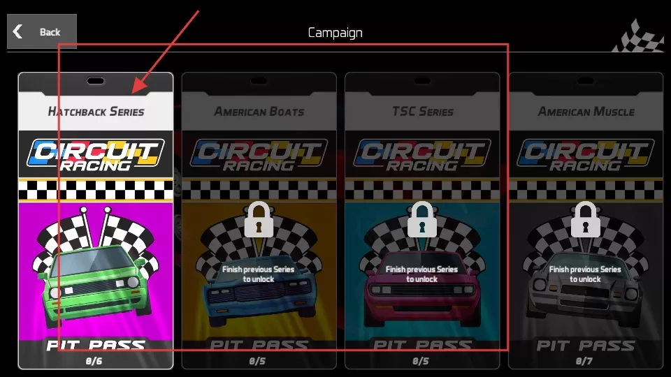 2、进入赛事选择界面,能看到不同系列赛事,选可参与的,开启赛车挑战。
