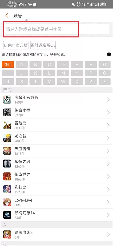 2、例如账号,进入后输入游戏名称或首拼字母。