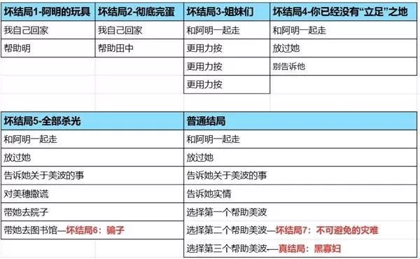 游戏存在坏结局与普通结局,其中坏结局有5个,普通结局仅有1个。以下为玩家提供触发不同结局的关键剧情选项,以供参考: