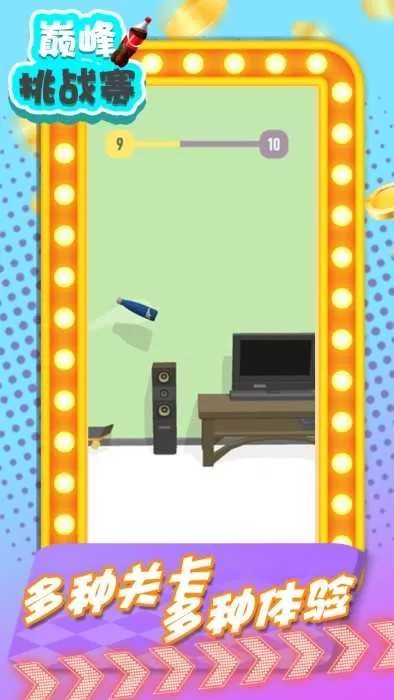 巅峰挑战赛是一种饶有趣味的挑战玩法。该游戏运用拟真物理引擎打造,玩家在此能够借助经典操作模式开启瓶子投掷。瓶子会以合理方式碰撞,玩家要使瓶子翻转后平稳落在各类不同位置,如此便可完成闯关。