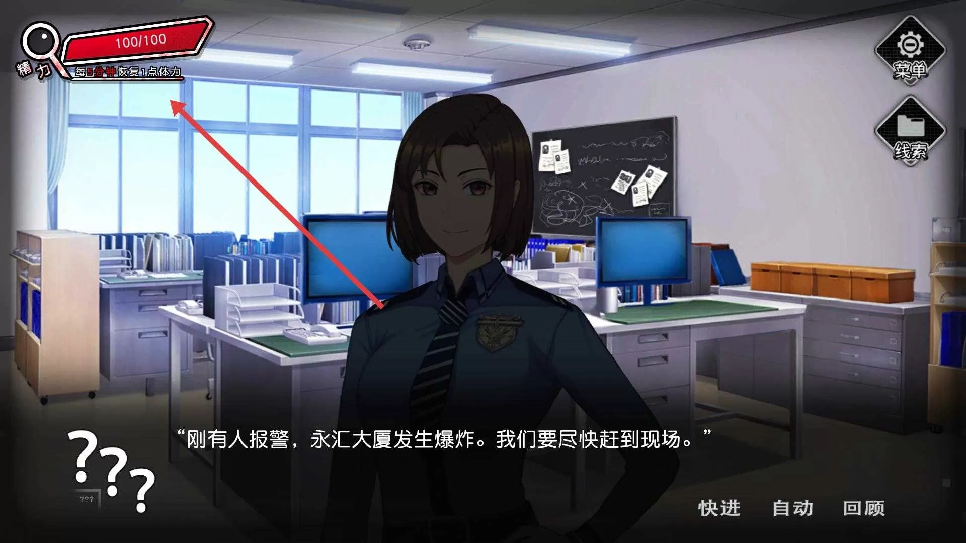 4、在章节主场景中与角色互动,推进剧情发展,同时留意左上角的精力值,合理安排游戏进程,随着剧情推进,逐步解开章节中的谜题。