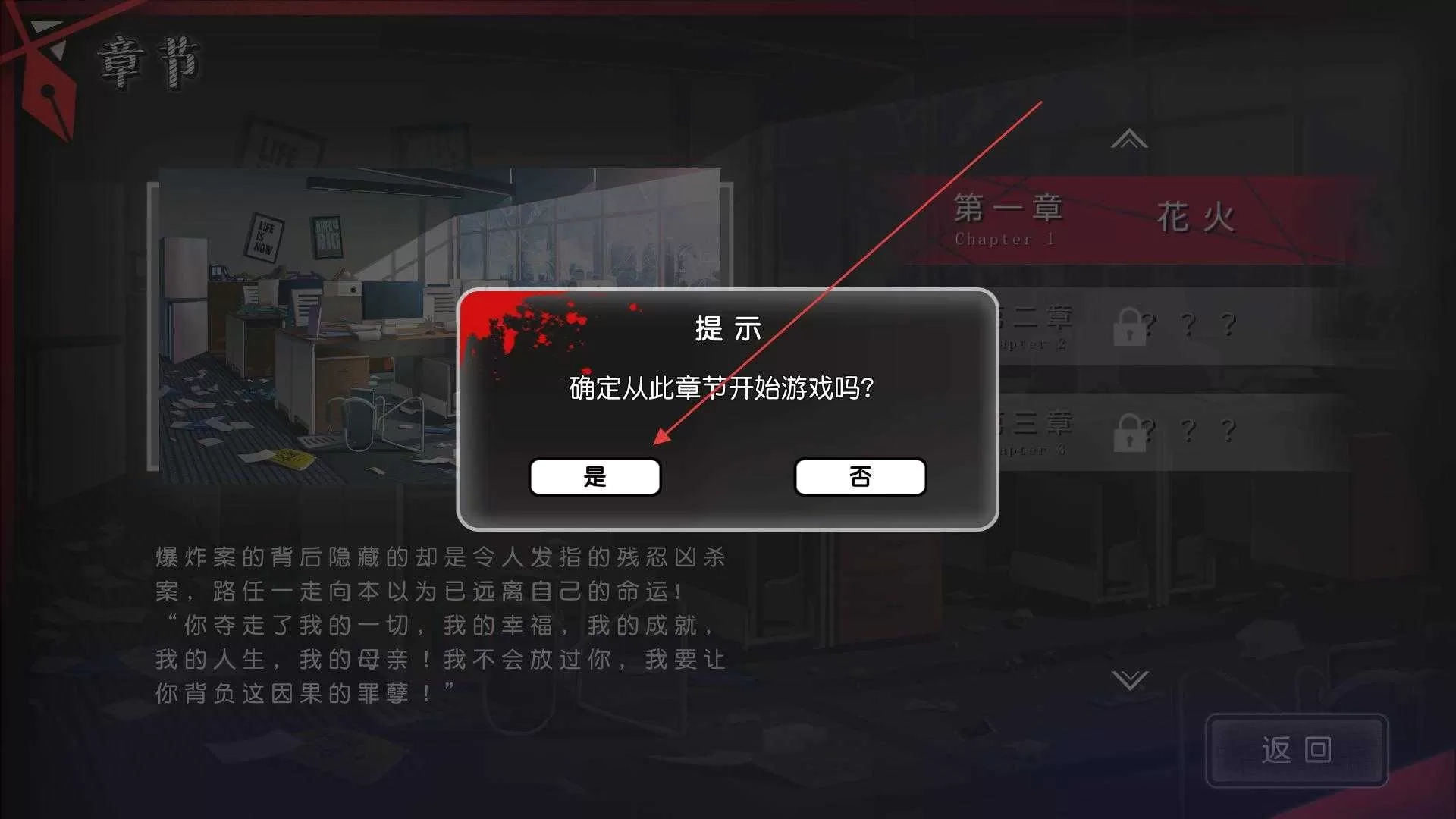 2、在章节选择界面,看到提示框询问确定从此章节开始游戏吗,点击是进入对应章节的游戏场景,开始章节内的冒险与探索。