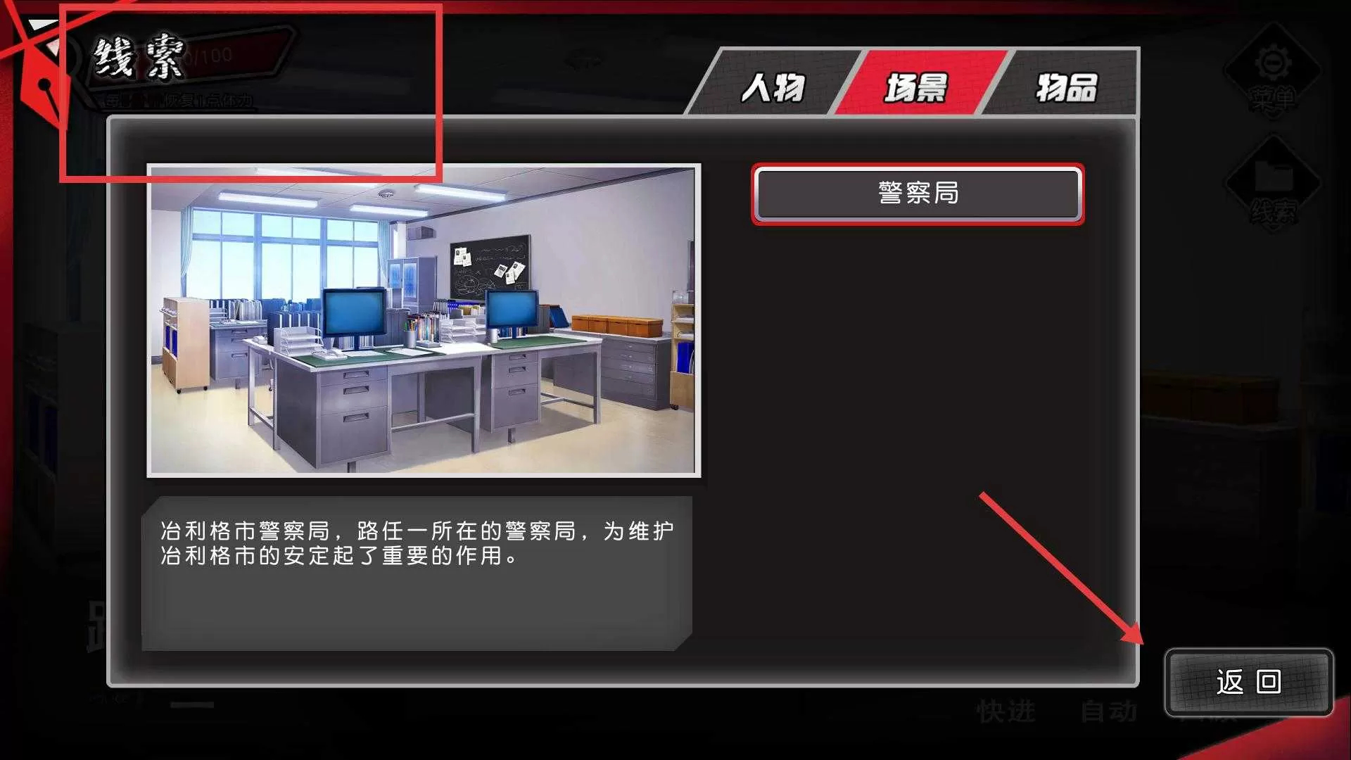 3、进入章节场景后,可查看线索界面,了解场景等相关信息,查看完毕后,点击返回,回到章节主场景,继续推进游戏剧情。