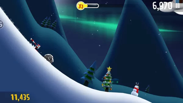 游戏屏幕上方会有此时的奖励状态,玩家通过在滑行中收集金币奖励、完成高难度动作等,可以填满奖励状态,从而激活各种高级工具例如火箭船等,还可以和企鹅、雪怪人一同搭载着火箭船奔向远方。