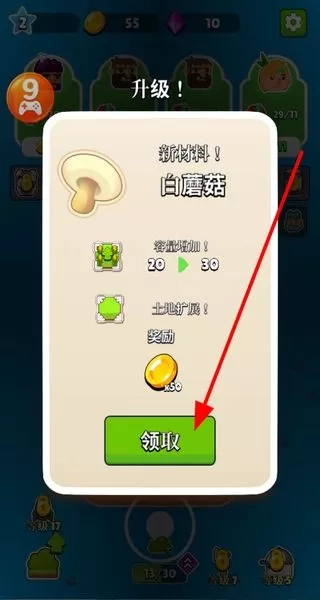 2、升级会解锁新材料,像白蘑菇,还能增加容量、扩展土地,完成升级后点击领取获取奖励。