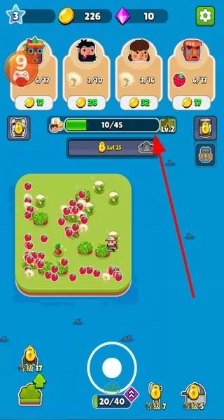 4、界面有经验条,通过收集作物、升级等操作积累经验,提升等级,解锁扩大更多农场内容。