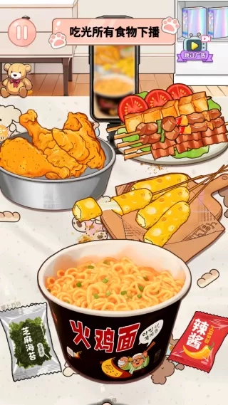 1、您需要严格按照步骤完成煮面、沥水、拌酱等操作,并根据挑战的辣度等级(从甜辣到核弹辣)准备食物。 2、随后进入关键的吃播环节,在计时限制内吃光全部食物,并利用丰富的表情与动作系统对辣度做出真实反应,以吸引观众。 3、最终,您的表现将转化为直播间的人气与打赏,这些收益是升级装备、解锁新内容的关键。