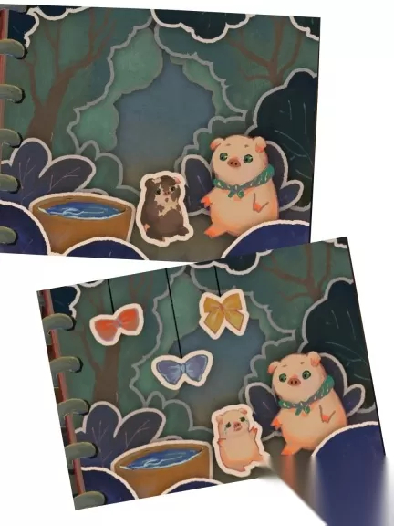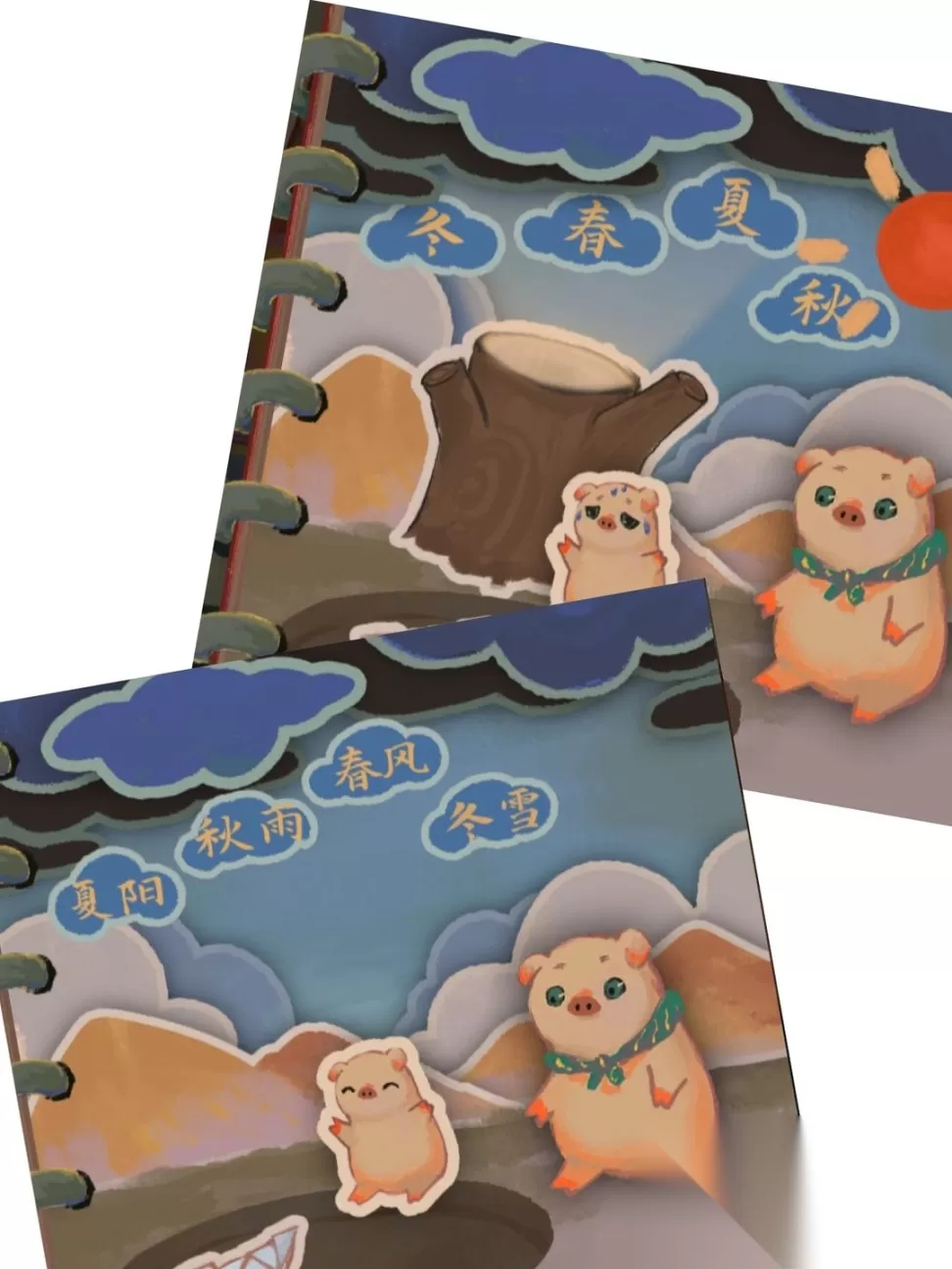将春拖到木桩上长出叶子给小猪遮荫,再拖动秋雨积起水洼让小白船漂浮