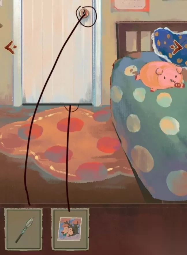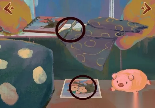 拉开门栓点击木门,把帽子小猪旁边的箱子点开,拿到圆盘(不知道叫啥姑且叫它圆盘)拖给 相机 ,拍下合照