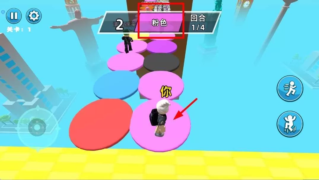 2、根据上方提示的颜色,比如粉色,操控角色移动到对应颜色的圆盘上,跟随颜色指引前进,完成每一轮的颜色匹配。