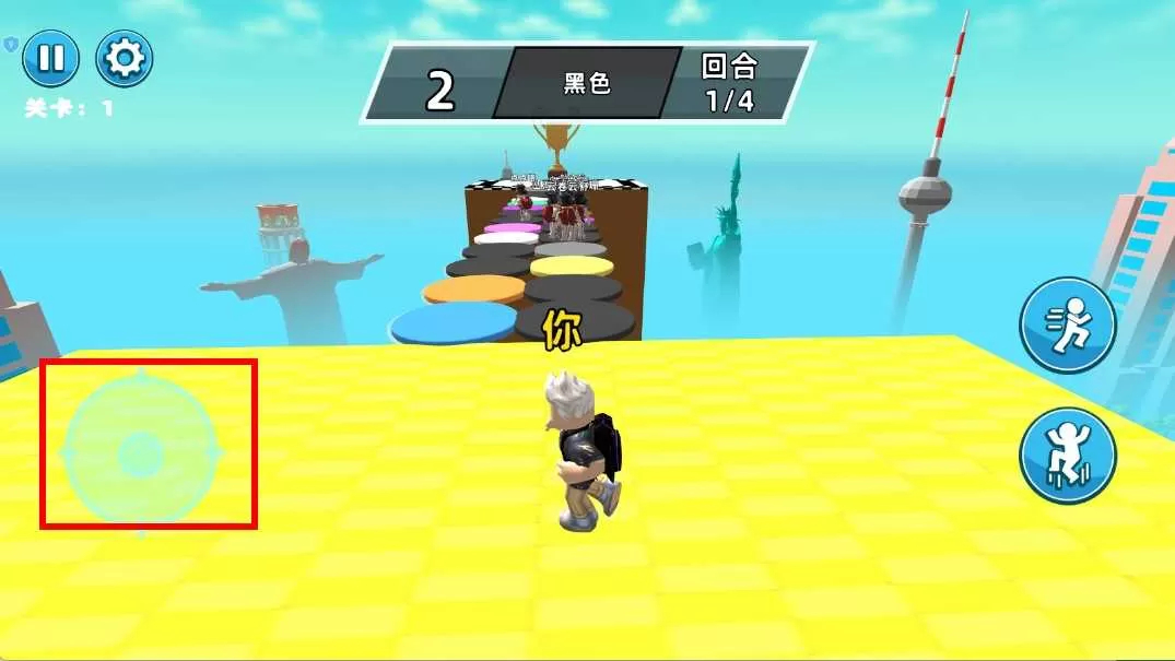 1. 踏入游戏关卡,通过操控左侧的虚拟摇杆,即可掌控角色在平台上移动,进而准备踏上由颜色圆盘构成的路径,开启闯关之旅。