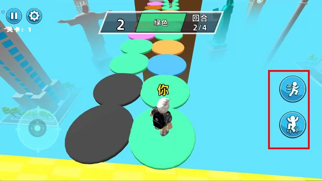 3、遇到需要快速移动或跳跃的情况,点击右侧奔跑、跳跃按钮,能让角色做出相应动作,顺利通过不同颜色的圆盘区域。