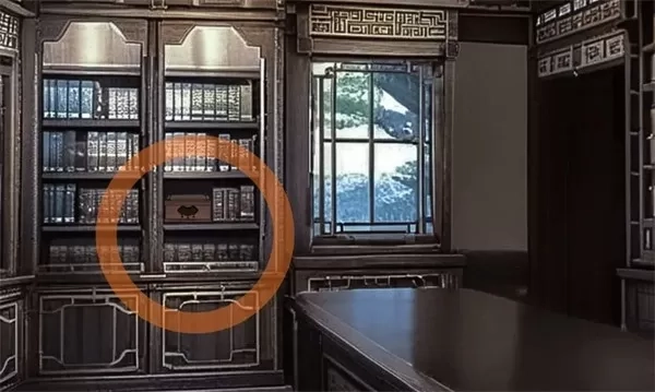 捡起地上的木偶,获取窗台上的木鸟,点击书柜下的天平图案,将砝码放上去。