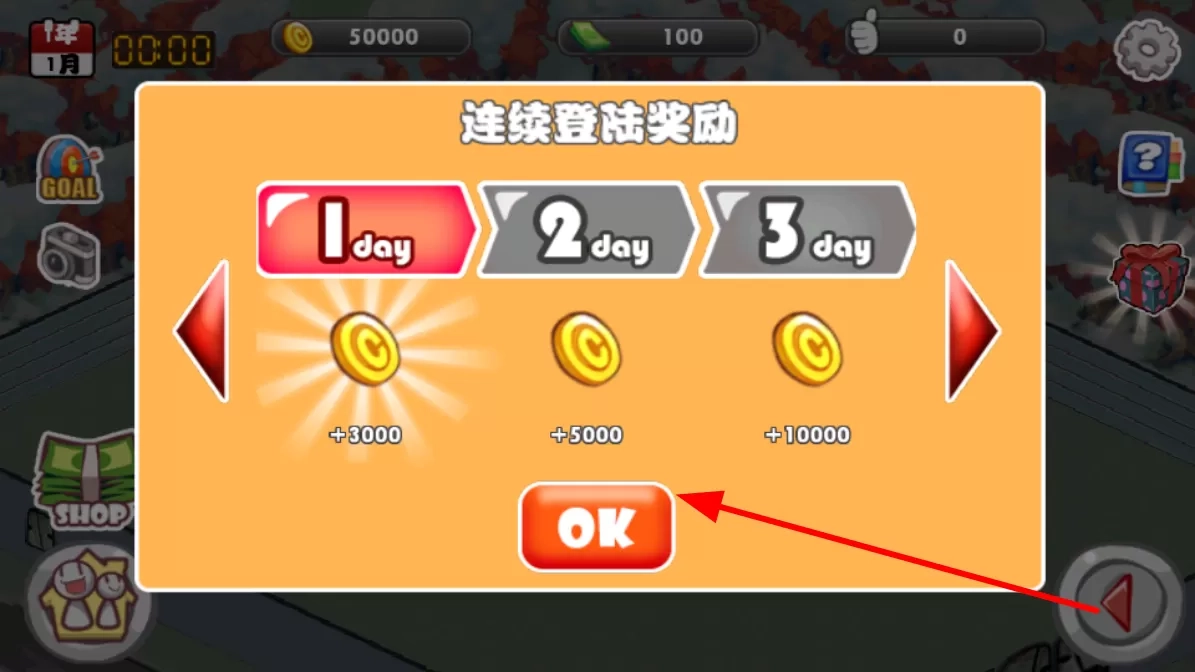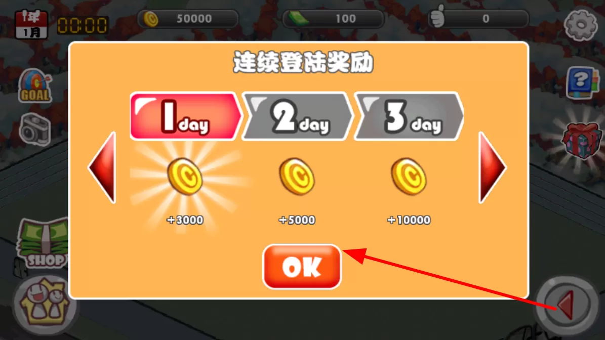 1. 持续登录游戏可获取奖励,登录天数递增,奖励的金币数量也随之增多,点击“OK”领取奖励。