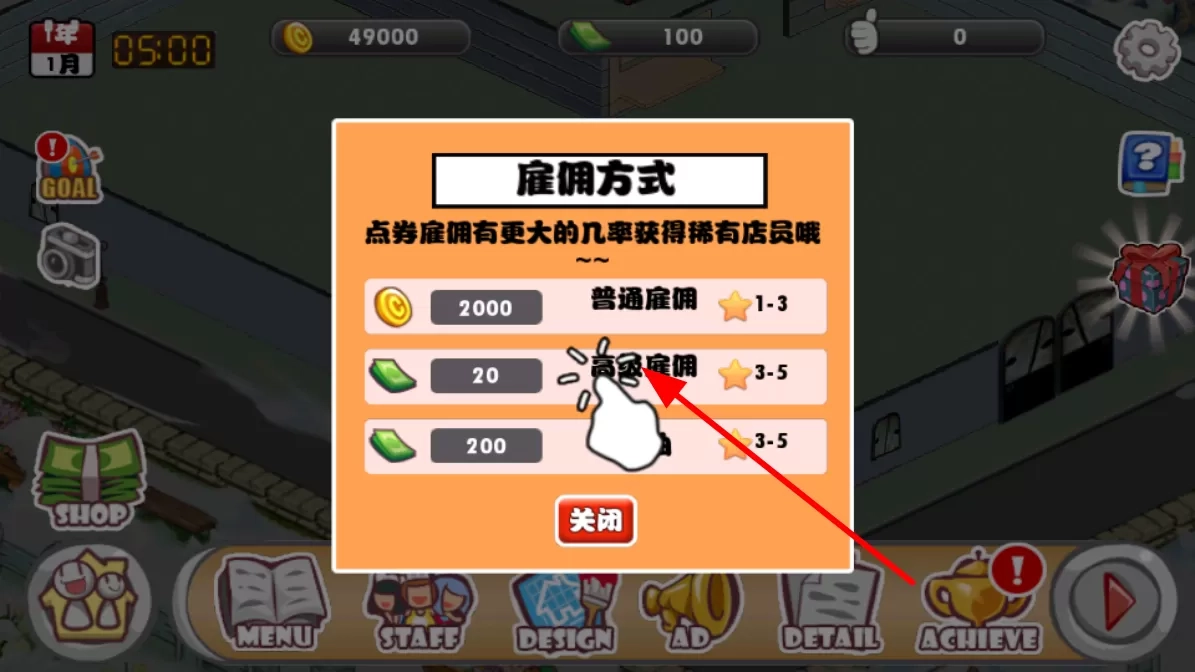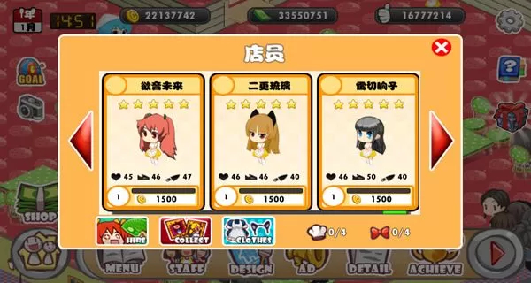 4、可通过普通雇佣、高级雇佣等方式雇佣店员,不同方式花费不同,所雇佣店员的星级与稀有度也存在差异。