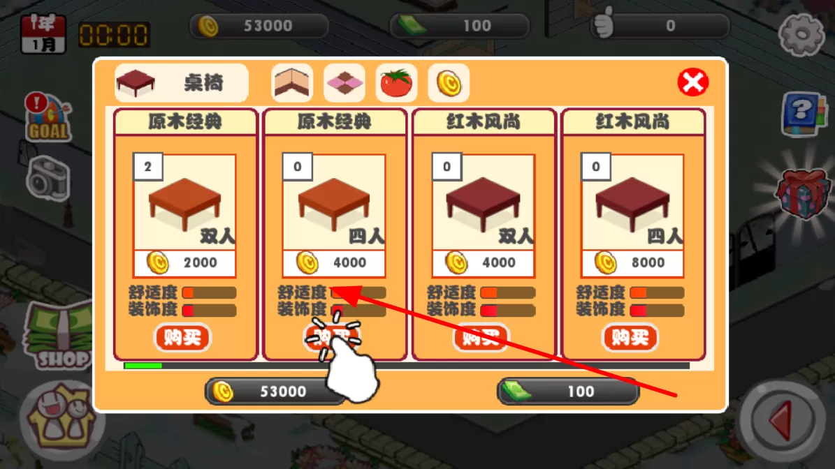 2、能够耗费金币来购置不同类型的桌椅,包含双人款、四人款等多种款式,而且不同桌椅在舒适度与装饰度方面存在差异。