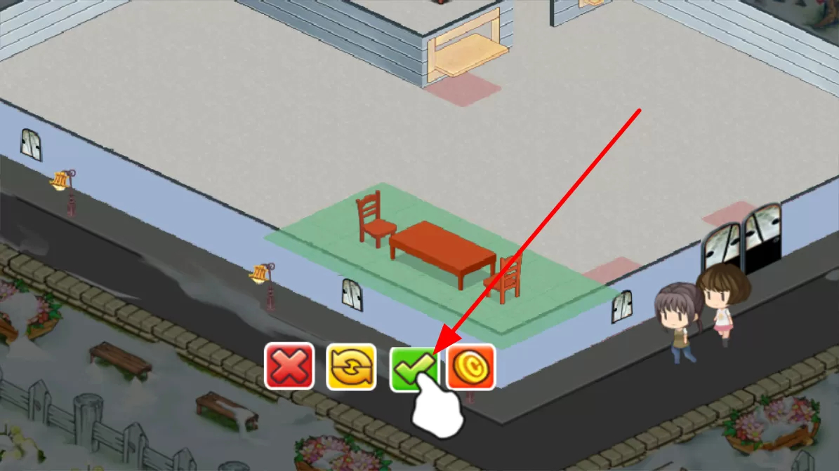 3、购买桌椅后,可将其在餐厅内进行摆放。摆放完毕后,点击确认按钮,即完成桌椅的布置,从而打造出餐厅布局。